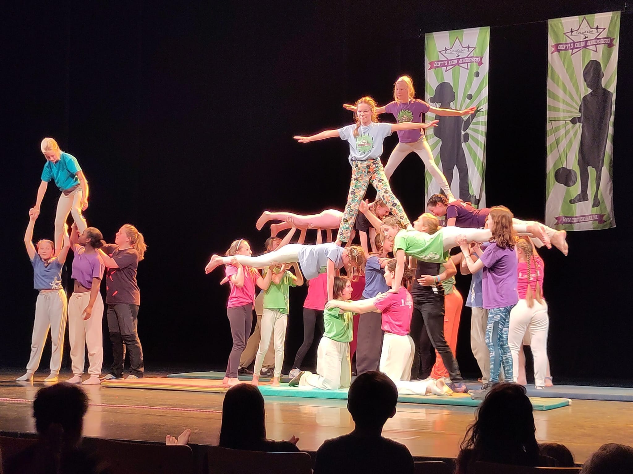 Deel van de lustrumshow in Theater de Veste met uiteenlopende acts, waaronder menselijke torens en eenwielers